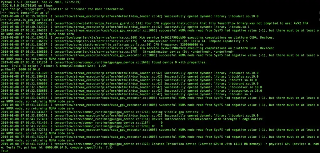 You can test if the gpu is enabled in Tensorflow. SSH into the virtual machine and then open python. Then write the following code. If the installation is successful you will see “True”.