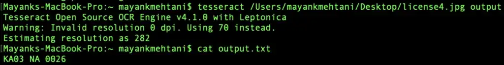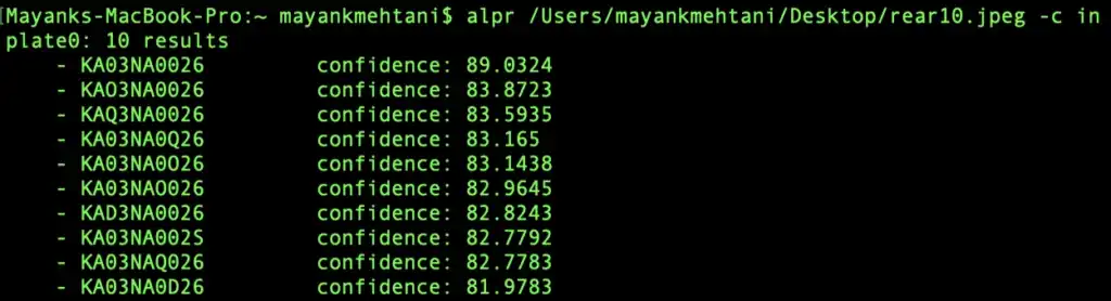 You can see the instructions for installing openalpr here. While tesseract is used just for OCR, OpenAlpr will segment the license plate from the photo itself and do the OCR for you. If you run a picture of a motor vehicle with OpenAlpr, it will return what it believes is the license plate number along with the confidence of the prediction. A cool feature OpenAlpr uses is that you can pass a country code to it, which greatly helps its ability to read license plates. Here is an example.