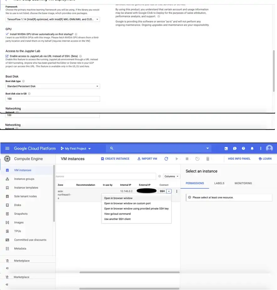 We’ll be launching a Deep Learning virtual machine. Click the “Launch on Compute Engine” button. Check the two boxes under the sections “GPU” and “Access to the Jupyter Lab”, and then click “Deploy”. Wait half an hour for the GPU drivers to be installed on the instance and then ssh into the instance (go to compute engine > VM Instances) to run our code.
