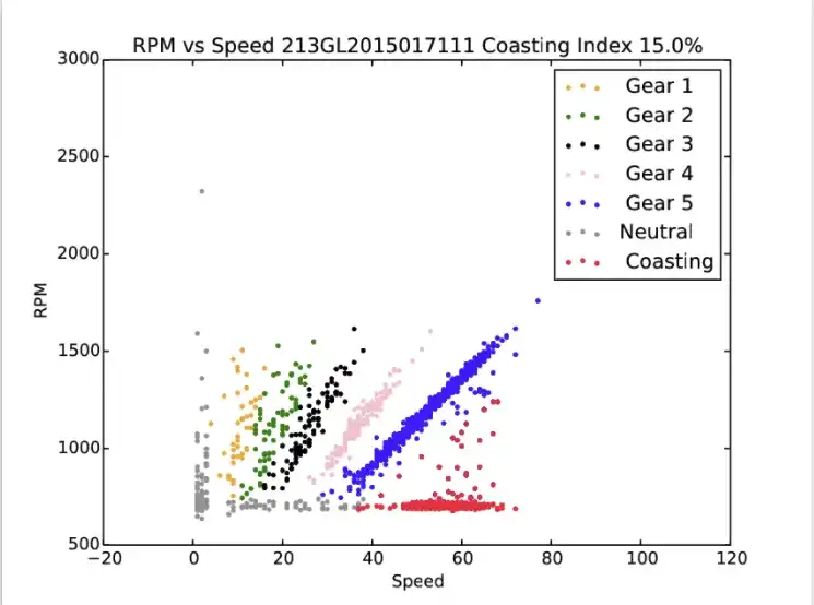 As seen in the figure above, with our algorithms we have been able to detect all gears and neutral driving (red spots). This driver drives on neutral about 15% of the time. We can also see that the driver begins to drive on neutral gear after he reached 60-65 kms/hr. He then goes back to gear at around 45 kms/hr. He does it opportunistically on highways and on slopes. We noticed similar behaviour in several professionally driven vehicles, including cars. It seems lots of professional drivers drive in neutral to save fuel.