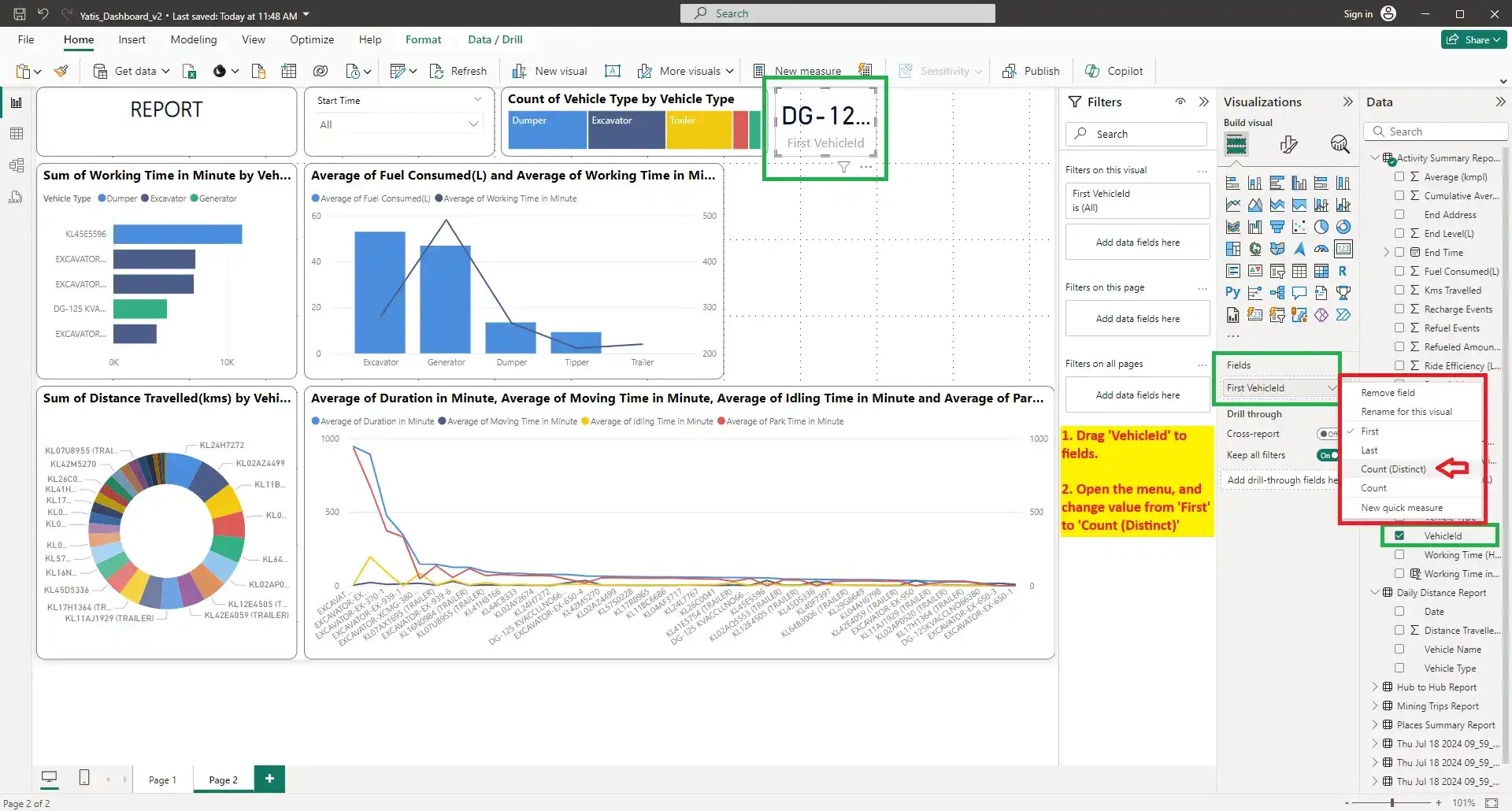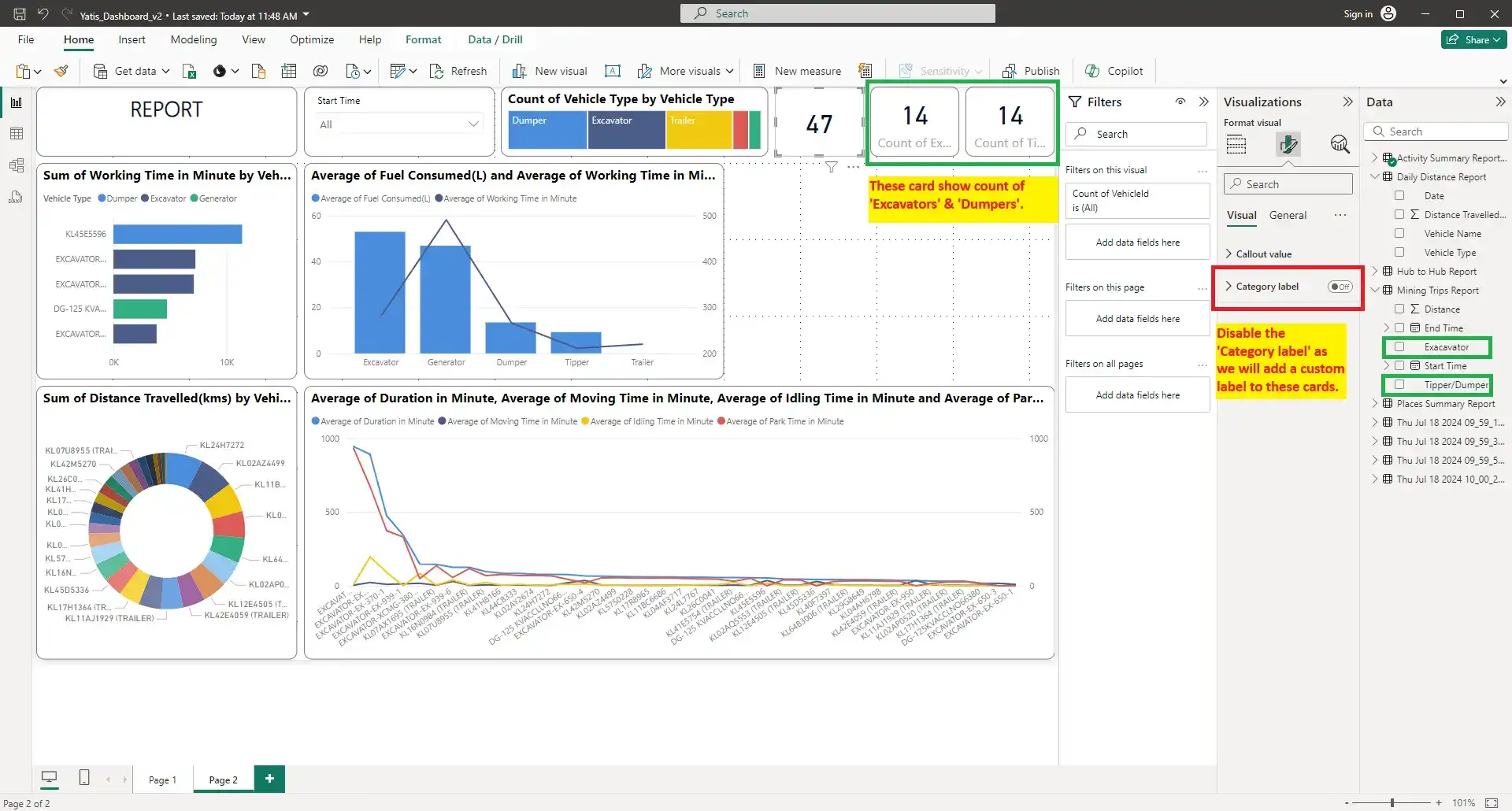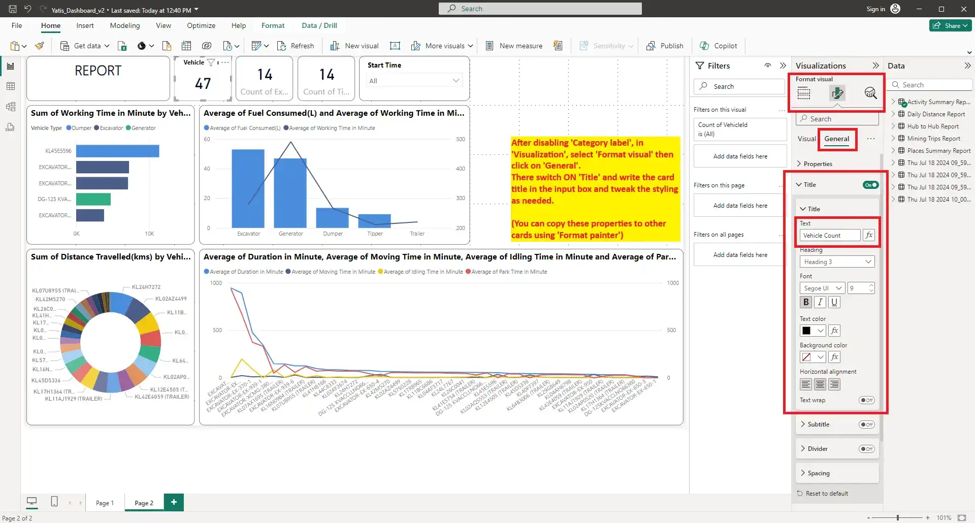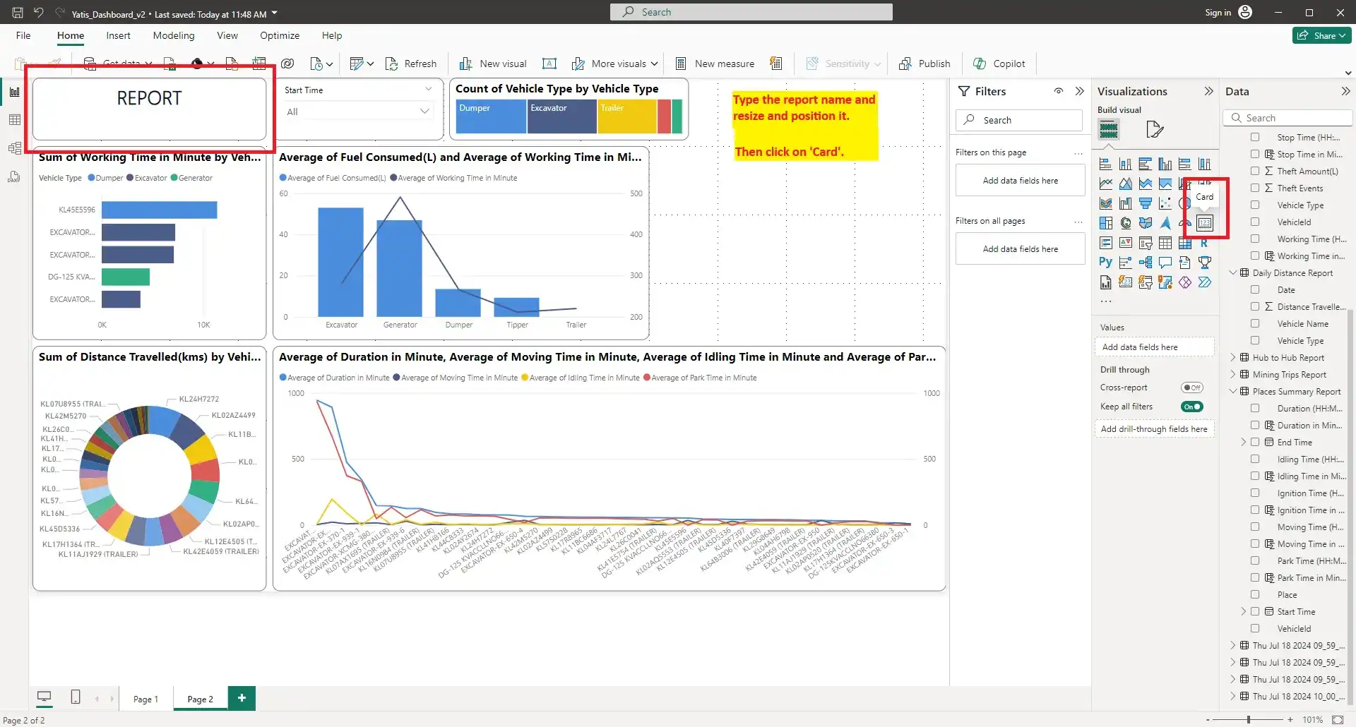 By adding a text box for the report name, cards for vehicle counts, and a detailed table, your Power BI report becomes a comprehensive and interactive tool for analyzing vehicle data.