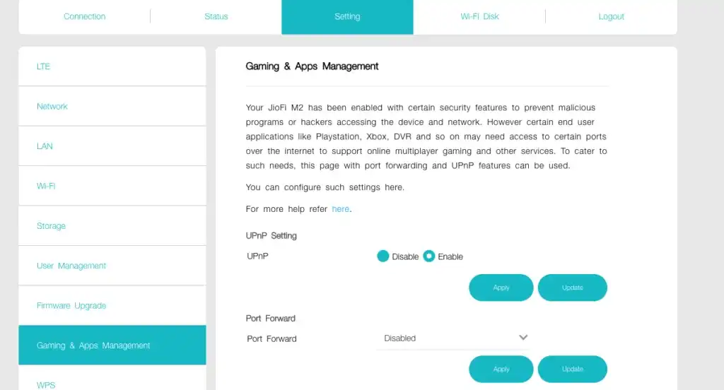 We now have to enable UPnP setting as can be seen in the image above. This can be accessed in Setting->Games & App Management. This was disabled on my JioFi and I presume it is disabled on all JioFis by default. Port forwarding is not required for CCTV camera live access and we can leave it disabled.