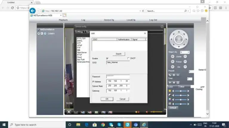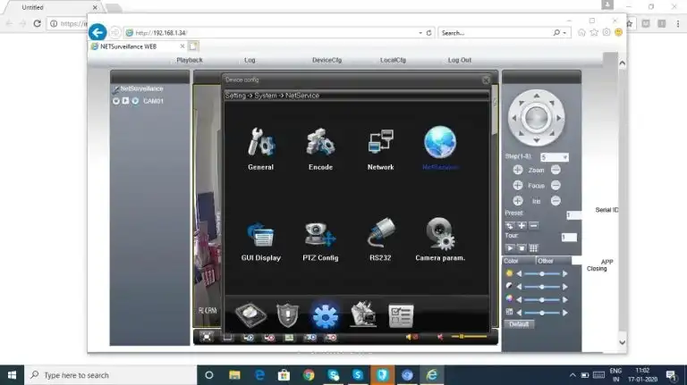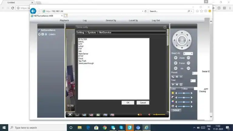 We have now setup a camera which is accessible on the LAN. To enable WiFi, we will configure the camera with the Wifi credentials. To do this, click of Device Cfg->Setting->NetService. The reference pictures are below