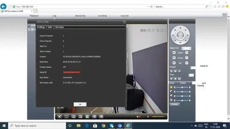 After you have logged into your app you will have need to link the app with the camera. This linking is done by using a serial number unique to your camera. To identify the serial number of your camera, go the NetSurveillance tool Setting->Info->Version and note the Serial ID.
